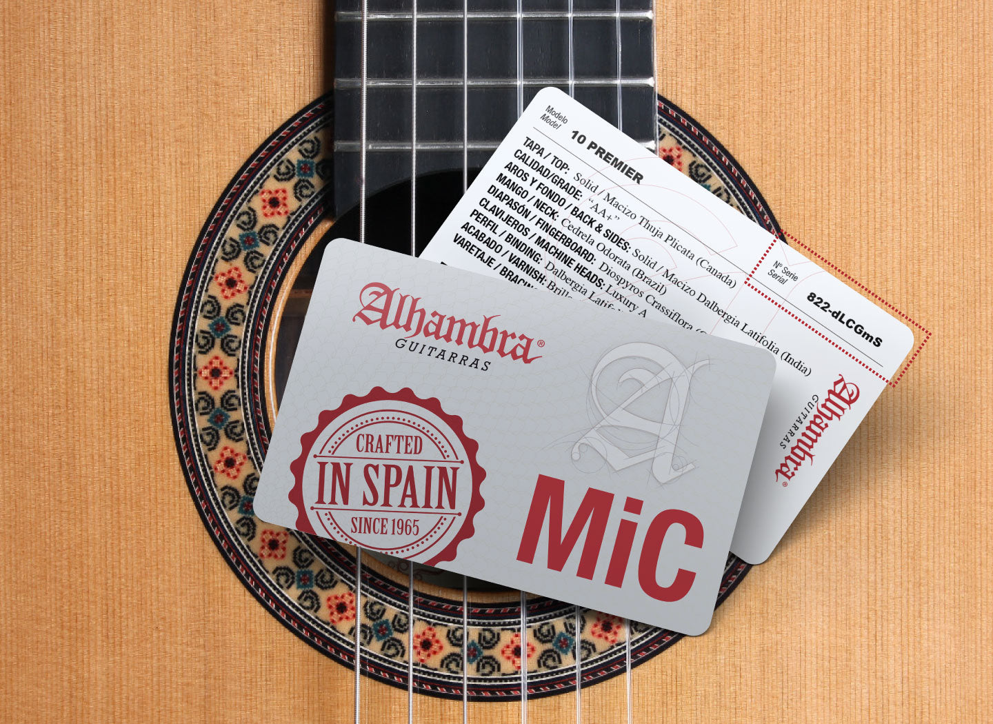 La scheda MIC è una carta di identificazione e autenticità per la tua chitarra. È unico ed esclusivo per ogni strumento e con la registrazione del numero di serie che compare su di esso, estende la garanzia della tua chitarra a 4 anni . Conserva la scheda MIC della tua chitarra: semplificherà tutte le comunicazioni con Alhambra e aggiungerà valore al tuo strumento.