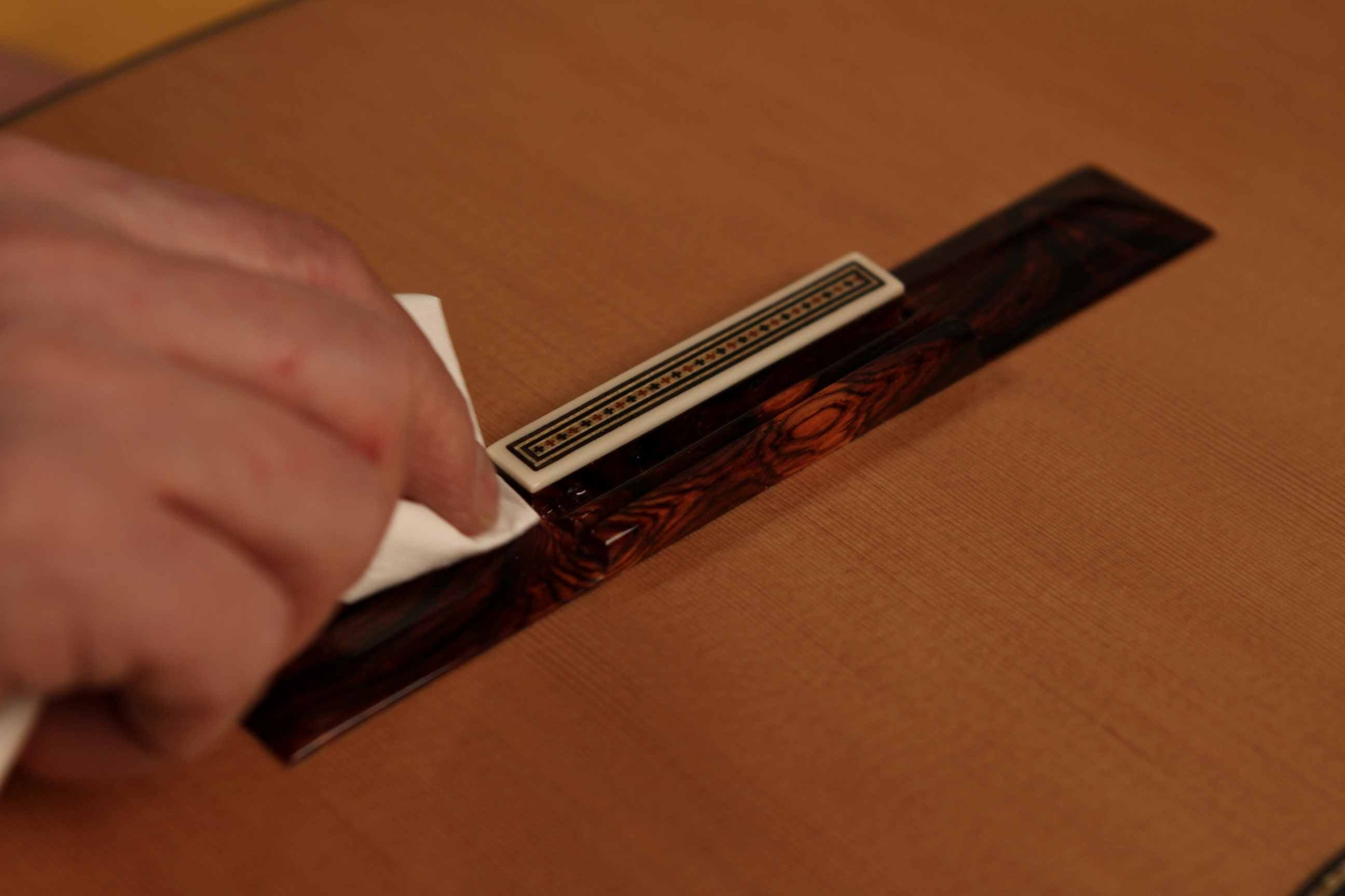 - To clean dust from the wood, simply rub gently with a slightly damp cotton cloth (you can use water or a specific guitar cleaning product). Always avoid products containing solvents or alcohol.